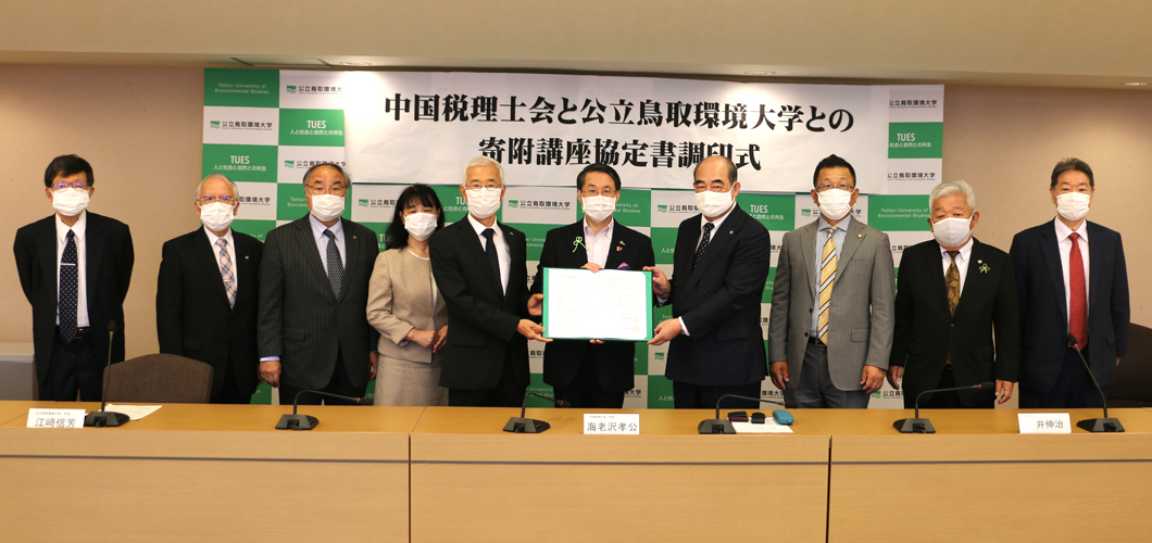 締結式では、寄附講座の地方税に関する講義を鳥取県職員が行われることから、平井鳥取県知事に立会人として参加いただき、寄附講座開設にあたって、期待のお言葉をいただきました。