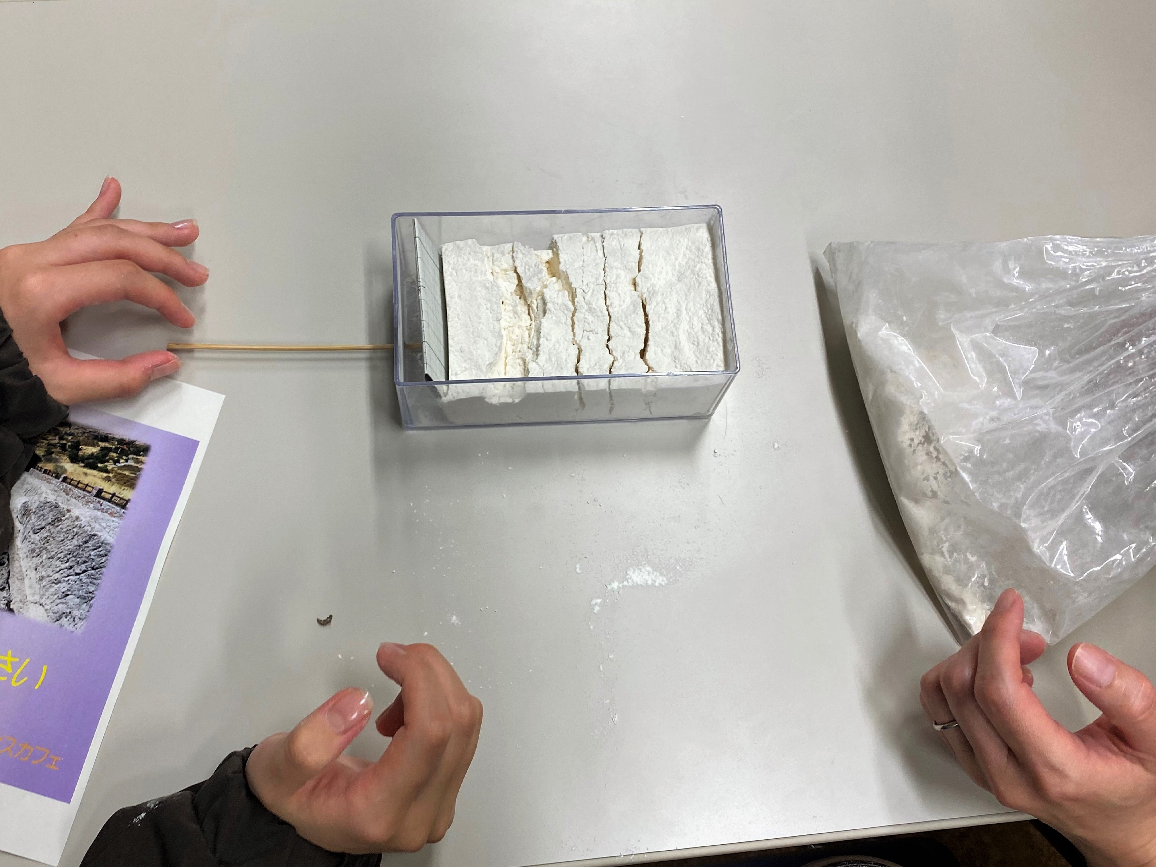 その中で、海外のジオパークについて、ギリシャやフランス、イタリアなどを例に挙げ、その地域に住む人々が地域の特色や宝について自発的に学び、活性化する取り組みに参加して伝統や知恵を継承しつつ経済活動と資産保全の両立を目指していることなどを紹介しました。また、小麦粉と簡単な装置を使い、大陸のプレート移動に伴って生じる割れ目の仕組みを知る実験をしました。
