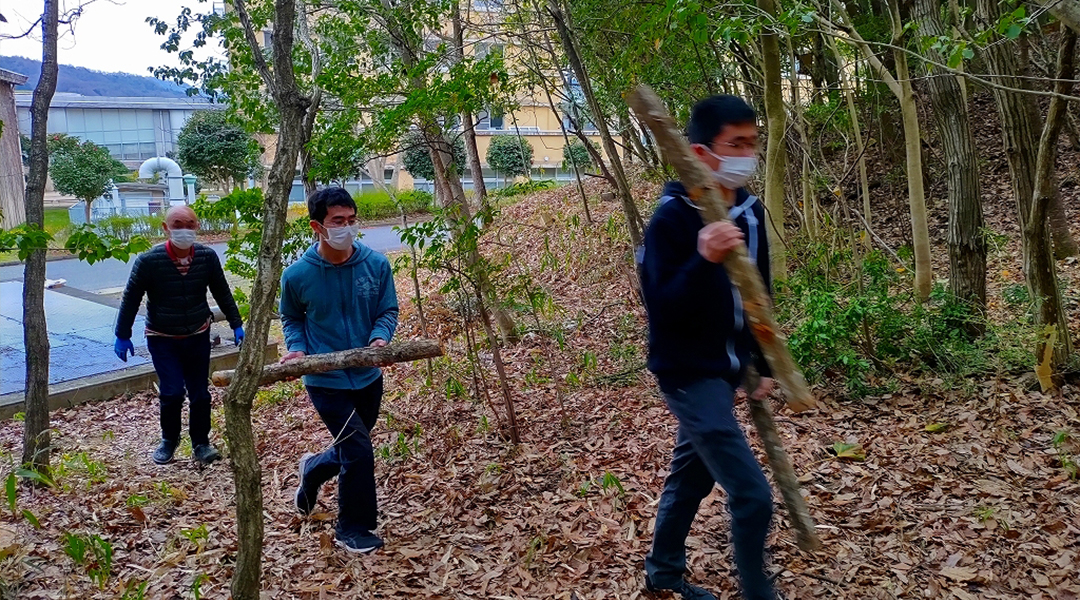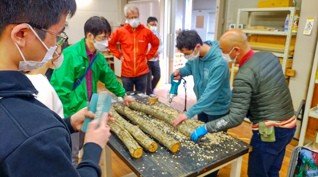 本学と鳥取商工会議所工業部会とのSDGs連携事業(※1)において、工業部会員である菌興椎茸協同組合の課題を解決するため、環境学部 金相烈 教授とそのゼミ生が、令和4年3月25日(金)に、原木しいたけ(ナラ等の原木に生える椎茸)の栽培実験を開始しました。