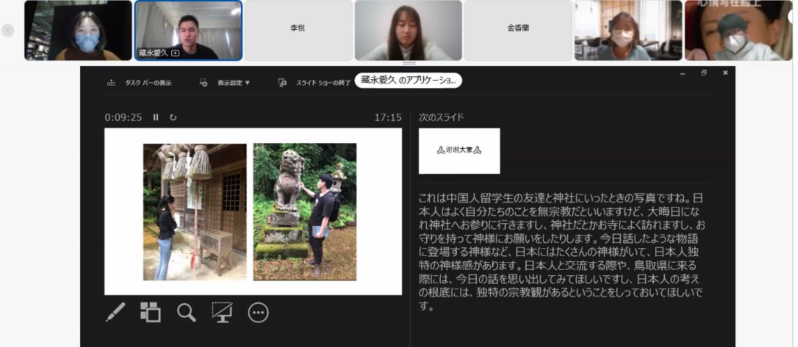 本学の学生と吉林大学外国語学院学生の相互発表では、各自の出身地とともに、自国の食文化、伝統的な衣装、漫画、小説などについても紹介し合い、とても楽しく交流することができました。