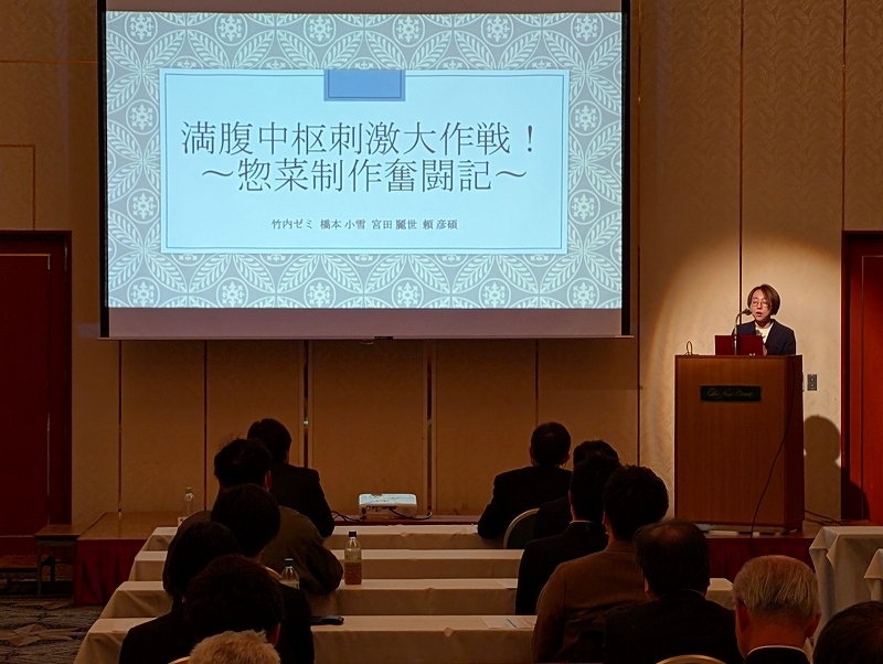 続いて、「満腹中枢刺激大作戦!~惣菜制作奮闘記~」と題して経営学部 竹内由佳 准教授とそのゼミ生である3年の橋本小雪さん、宮田麗世さん、頼彦碩さんからゼミ活動の発表がありました。竹内ゼミでは、地元スーパーのサンマートと弁当の新商品開発の共同研究を行っています。その研究の過程で出来た「全国のお米食べ比べおにぎりセット」「みんなのためのお子様ランチ」「ご当地給食弁当」「片手で満足できるおにぎり」といった商品案を紹介し、それぞれの商品のターゲット及びコンセプトを説明しました。そして、その案のなかから大学内での人気投票(アンケート)によって「片手で満足できるおにぎり」を商品化することが決まったことを話しました。その後、試作を何度か繰り返し、様々な改善を行いながら職員及び学生対象のモニター調査を経て学内での試験販売にまで漕ぎ着けたことを説明しました。おにぎりの具材は、牛めし・鯖・ソースカツの三種類として、モニター調査や試験販売で非常に好評であったことを話しました。終わりに今後の展望として「次第に販路を広げて様々な顧客の手に渡るようにしたい」ことや「さらにユニーク性に富んだものを開発して可能性を広げたい」こと等を紹介し、発表を終えました。